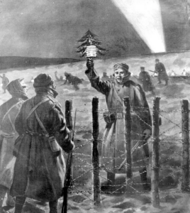 „(…) Am 24. Dezember 1914 kam es sowohl an der Ost- als auch an der Westfront zu Waffenstillständen zwischen einfachen Soldaten. Diese Feuerpausen wurden nicht organisiert, sondern waren spontane Rebellionen der einfachen Frontsoldaten gegen den Krieg und die Generäle. Auch, wenn es nicht genau rekonstruierbar ist, fing alles wahrscheinlich bei Rue du Bois (Ortschaft in Frankreich an der Front) an.