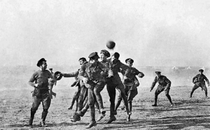 Weihnachten 1914: Britische und deutsche Soldaten spielen zusammen Fußball.