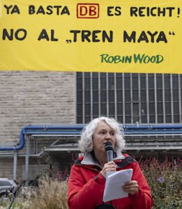 „Tren Maya“, zu deutsch „Maya-Zug“, ist ein Megainfrastrukturprojekt im Süden Mexikos, an dem sich zahlreiche deutsche Unternehmen, allen voran die Deutsche Bahn, aber auch Siemens, TÜV oder Heckler & Koch beteiligen. In ihrer Rede auf der Kundgebung in Stuttgart sagte die ROBIN WOOD-Aktivistin Angelika unter anderem: (…) „Wir stehen heute hier, weil sich der staatseigene DB-Konzern an einem gigantischen Projekt im Südosten Mexikos beteiligt. Das Schienen-, Autobahn- und Flughafen-Projekt wird von der mexikanischen Regierung ‚Tren Maya‘ genannt und schon das ist ein Begriff, gegen den sich die indigenen Menschen und Organisationen vor Ort wehren und den auch wir ablehnen. Es ist ein Name, der die Rechte der indigenen Menschen und die jahrtausendealte Kultur der Maya missachtet.“ (…).