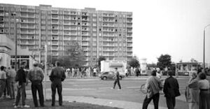 An diesem Samstag im Jahr 1992 versammelte sich eine große Menschenmenge vor der “Zentralen Anlaufstelle für AsylbewerberInnen” (ZASt) im Rostocker Stadtteil Lichtenhagen. Aus dieser Ansammlung heraus ereigneten sich die ersten Angriffe auf das, wegen seiner Fassadenbemalung, so benannte “Sonnenblumenhaus”: Steine wurden in die Fensterscheiben der Wohnungen ehemaliger vietnamesischer GastarbeiterInnen geworfen, die im selben Gebäude ein Wohnheim hatten. Ein erster Ansturm von 500 Leuten auf das Haus konnte zunächst von den BewohnerInnen zurückgeschlagen werden. Den Angreifern wurde dabei von mittlerweile bis zu 2000 zuschauenden BürgerInnen tatkräftig zugejubelt.