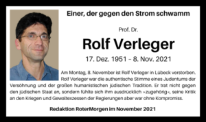 Mit Rolf Verleger verlieren eine wichtige jüdische Stimme des Humanismus und des Engagements für den Frieden. Wir sind tief bestürzt und traurig. Wir werden die Arbeit Rolfs für Frieden und Gerechtigkeit würdigen und weiterverbreiten.