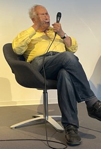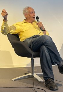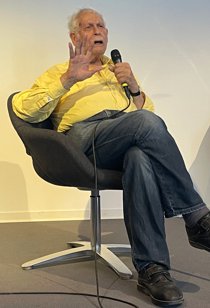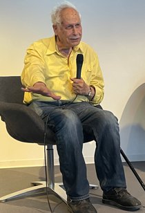 Anschließend begrüßte der Moderator, F.-B. Habel, einen Zeitzeugen: Dean Reeds langjährigen Dolmetscher und Freund Victor Grossman. Er war neben Dean einer der wenigen US-Amerikaner, die in der DDR lebten. Victor Grossman ließ im lockeren Gespräch mit F.-B. Habel persönliche Erinnerungen an Dean Reed aufleben und erzählte auf anschauliche, humoristische und spannende Weise Anekdoten von der gemeinsamen Arbeit mit Dean bei verschiedenen Filmdrehs. Außer seinen Erinnerungen an Dean im Kosmos der DDR-Promis kamen Fragen des Alltags in der DDR und des Umgangs mit den Kollegen beim Film und bei Konzerten zur Sprache sowie seine Gedanken über die Interviews für Podcasts und Filme, für die Victor Grossman in den letzten Jahren zu Dean befragt wurde.