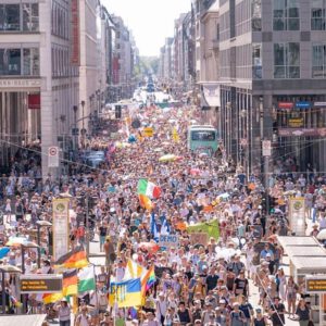 Although they merrily defied city or state ordinances, the Berlin police did nothing to stop the parade until its very end when they announced that its leaders would be “held responsible”. A final later meeting at another site was broken up – after it was all but over. In general, the police have arrested a few but usually been gentler than is their wont.