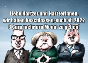 Rosige Zeiten für mich und alle Bezieher/innen von Sozialleistungen! Zum Jahresbeginn 2022 werden die Regelleistungen angehoben. Der Eckregelsatz soll um 3 Euro steigen. 3 Euro mehr Hartz-IV oder Sozialhilfe im Monat entsprechen 10 Cent am Tag, einer Anhebung von nicht einmal 1 Prozent und das in einer Zeit, in der die Inflationsrate in Deutschland bei 3,8 Prozent liegt und zum Ende des Jahres weiter steigen könnte. Schon daraus ergibt sich eine reale Kürzung.