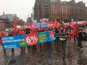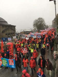 Am 15. November haben die Tarifverhandlungen zwischen der Gewerkschaft IG Metall und dem Arbeitgeberverband Nordmetall begonnen. Die Verhandlungen betreffen etwa 140.000 Arbeiter in Norddeutschland. Der Beginn der Verhandlungen wurde von einer Arbeiterdemo begleitet, an der sich 1500 beteiligten. Neben Hamburger Betrieben wie Mercedes, Still, Aurubis, Jungheinrich, Siemens und viele mehr kamen auch viele Kollegen mit Bussen aus Metallbetrieben aus den Bundesländern Bremen, Mecklenburg-Vorpommern, Niedersachsen und Schleswig-Holstein. Die Metallarbeiter fordern eine Verkürzung der Arbeitszeit und einen Lohn, der zum Leben reicht.
