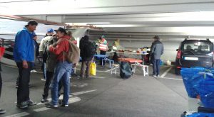 Los ging es Quer durch die Stadt zum Millerntor-Stadion, also unmittelbar am Kiez von St. Pauli. Dort befindet sich das Einkaufszentrum „Rindermarkthalle“ mit einer riesigen Parkgarage. Die ersten „Engel“ waren schon angekommen und bauten ihre Stände mit Klamotten, Schuhe, Getränke, Rucksäcke, Hygieneartikel und Schlafsäcke auf. Wir parkten an einer Wand und im Nu waren viele Helfer da, die Tische und Bänke aufbauten, unser Auto mit entluden und in kürzester Zeit einen Tresen für all das leckere Essen aufbauten, das Susi gekocht hatte.