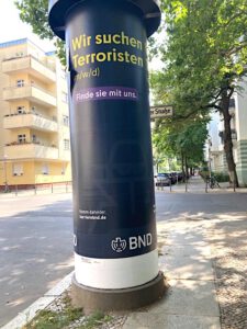 Mitten in Berlin-Charlottenburg hängt ein staatliches Propagandaplakat an einer Litfaßsäule: „Wir suchen Terroristen“, lässt der Bundesnachrichtendienst verlauten. Der bürgerliche Staat, dessen Außenpolitik seit Jahrzehnten auf imperialistischer Intervention und Kriegsführung beruht, sucht nun „Terroristen“ per Plakat – eine Farce, die kaum zynischer sein könnte.