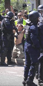 In Frankreich scheint es eine heftige Debatte über dieses Bild zu geben und in den Medien ist versucht worden, den Mann, der hier auf Knien zu sehen ist, als betrunkenen Irren darzustellen (dem von Anwesenden auf dieser Demonstration widersprochen wird). Allein diese Tatsache, dass das Bild solche Debatten auslöst, zeigt, dass die Herrschenden sehr wohl erkennen, was da zu sehen ist.
