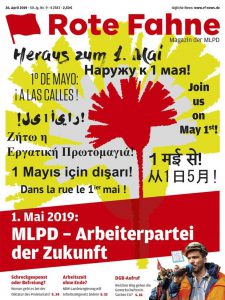 Diese unhaltbaren Zustände unter den Kollegen/-innen werden gern unter den Teppich gefegt, besonders von den Reformisten und Revisionisten in ihren Erklärungen zum 1. Mai. Da werden von artige Forderungen oder wirre Theorien aufgetischt, doch von den wahren Problemen dringt nichts in ihre Studierstuben und Lügenfabriken, denn leidende Proleten gibt es für sie schlichtweg nicht. Meist wird mit viel Tamtam, Bratwurst, Bier und Krawallmusik, zwecks Betäubung der Sinne, aufgewartet. Es werden „Sonntagsreden“ gehalten und mit viel Gebrüll aus den Verstärkeranlagen untermalt. Und so zieht der Prolet mit der Faust in der Tasche wieder nach Hause oder bleibt gleich ganz auf dem Sofa. Viel Papier wird auch verkauft und verteilt, wie z. B. die Maizeitung des DGB oder für 2,50 € oder die Rote Fahne der MLPD zum 1. Mai. Die trägt in diesem Jahr den Titel: „1. Mai 2019: MLPD-Arbeiterpartei der Zukunft“. Waschmittelwerbung ist noch besser als dieser hohle Spruch. Sollen die Arbeiter warten bis zur Zukunft, wenn sie mal als Arbeiter was zu sagen haben? Am sogenannten St. Nimmerleinstag?